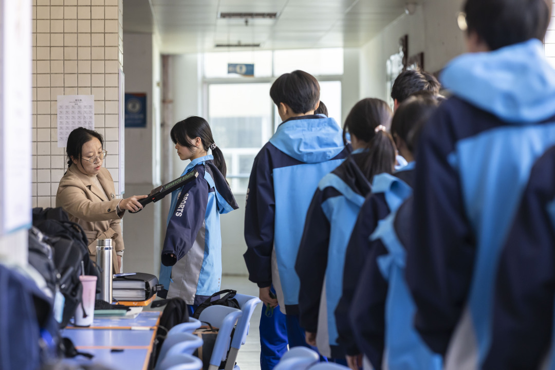 1月13日下午,记者在广州市花都区职业技术学校看到,思想政治科目考试进场时,监考老师用金属探测仪检查考生是否携带“违禁物品”。“对我来说,这次肯定是能体现综合高中和普通高中学习差距的一次大考。”已考完两科的学生曾紫荧坦言,试题难度适中,但难题富有挑战性,心里也会有些紧张,考前会着重复习弱势科目。对于以前错得多的题,她会找同类题目进行强化训练,不会的题就找老师和同学帮忙辅导。