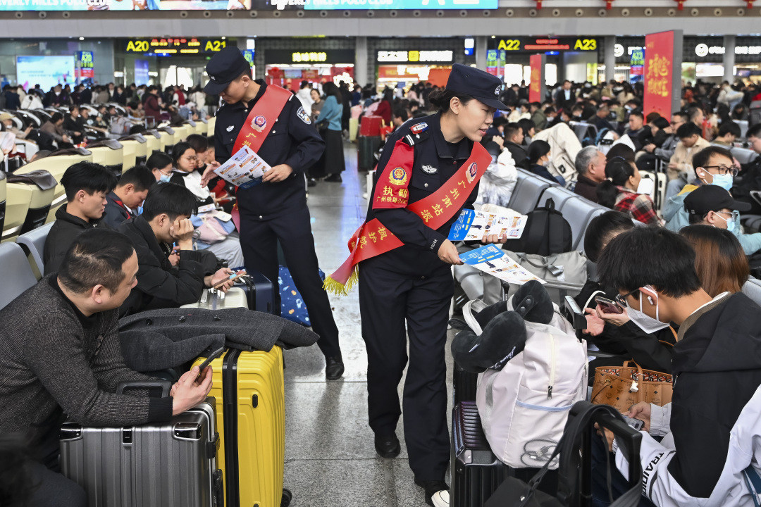 1月14日是2025年春运首日,广州南站派出所开展“南枫”护航队授旗誓师仪式,并立即启程前往春运第一线开展反诈宣传和爱民实践活动。截至昨日18时,广州南站派出所已接警21起,其中求助19起;在护航队的工作下,找回遗失行李10件,挽回经济损失3万元,找回站内走散老人、儿童4人。