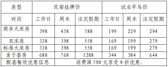 小南了解到,永安·十麦民宿试营业期间(1月15日至2月14日),民宿客房及配套餐饮将推出早鸟价优惠,优惠信息如下: