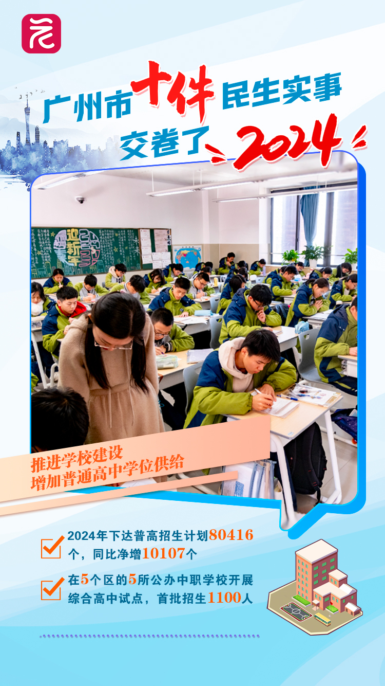 2024年,广州市下达普高招生计划80416个,同比净增10107个;在5个区的5所公办中职学校开展综合高中试点,首批招生1100人。2025年,广州力争再新增普通高中学位1万个。