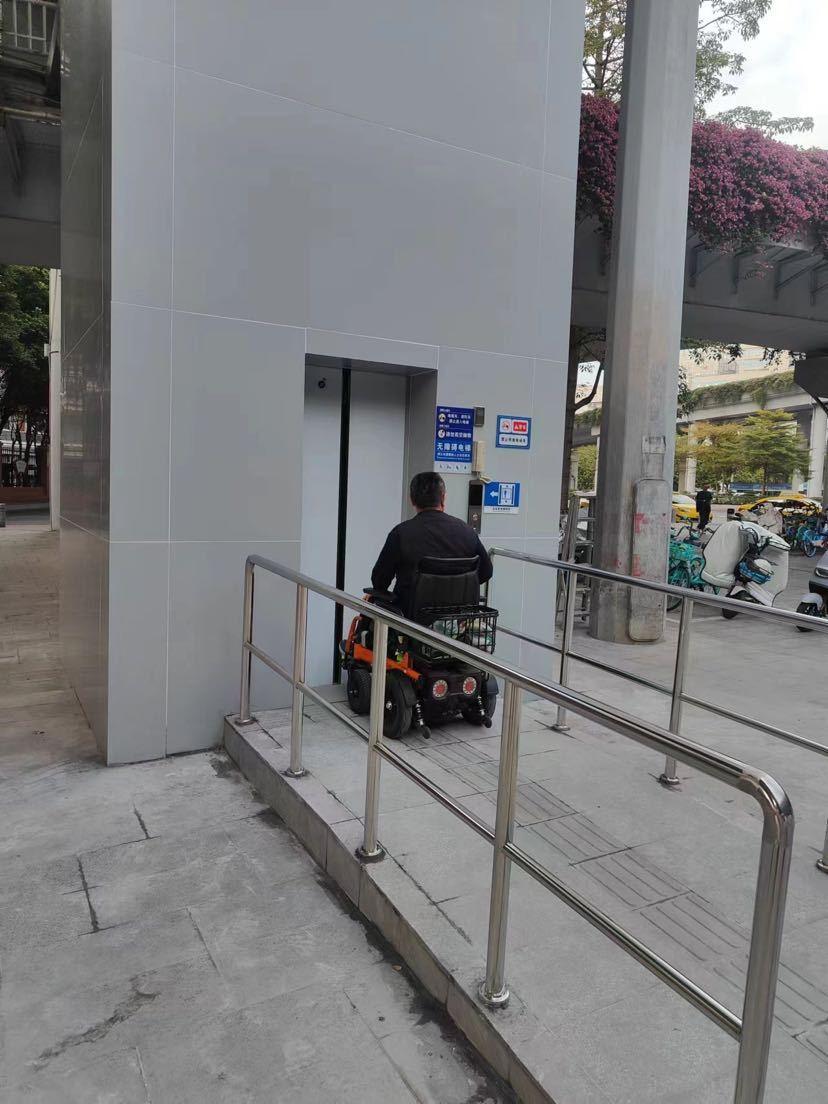 在市政设施无障碍改造工程中,垂直电梯和无障碍升降平台都是常采用的形式。无障碍升降平台通常运用在场地有限不具备安装电梯条件的点位。例如,在东风路-陵园西路,东风路-福今路无障碍升降平台。垂直电梯相较于升降平台,具有轿厢空间大、运行速度快,使用体验好,且无须专人现场值守等优势。