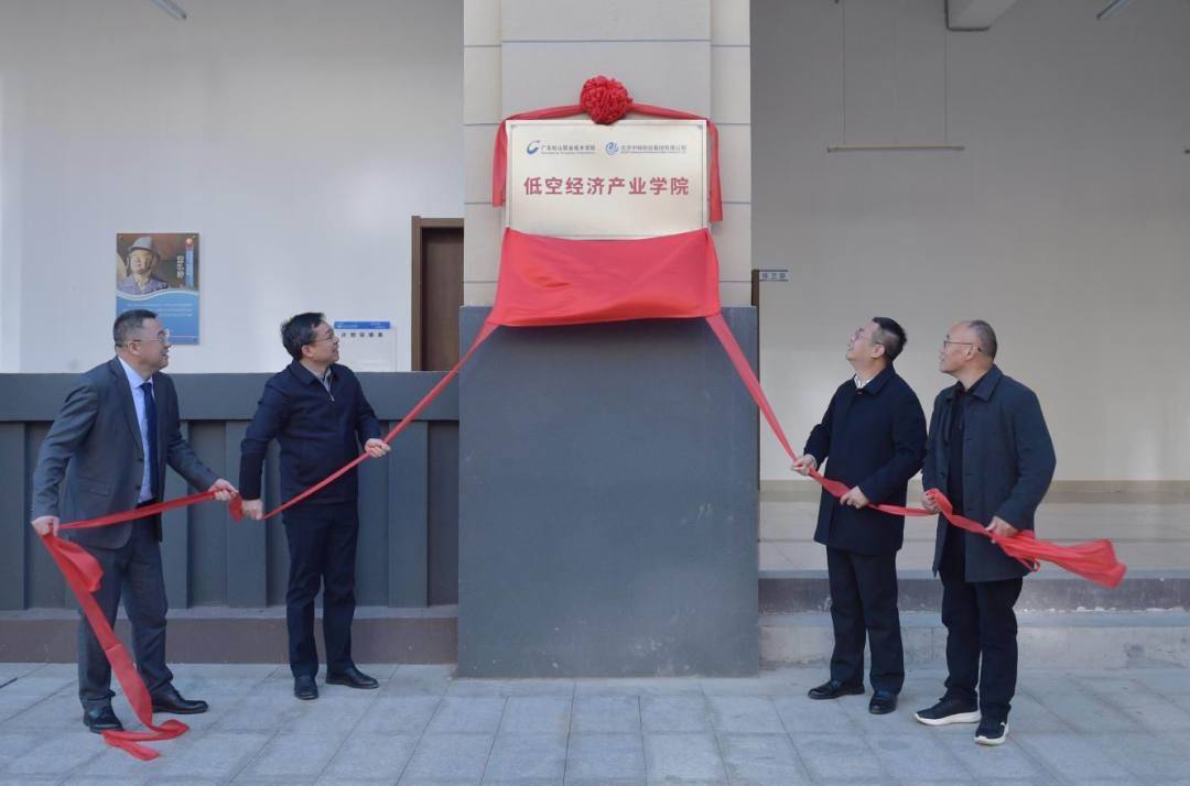 在韶关市人民政府见证下,松山学院党委副书记张林茂与北京中联航投集团总裁李强共同签署合作框架协议。随后,相关领导共同为低空经济产业学院揭牌。