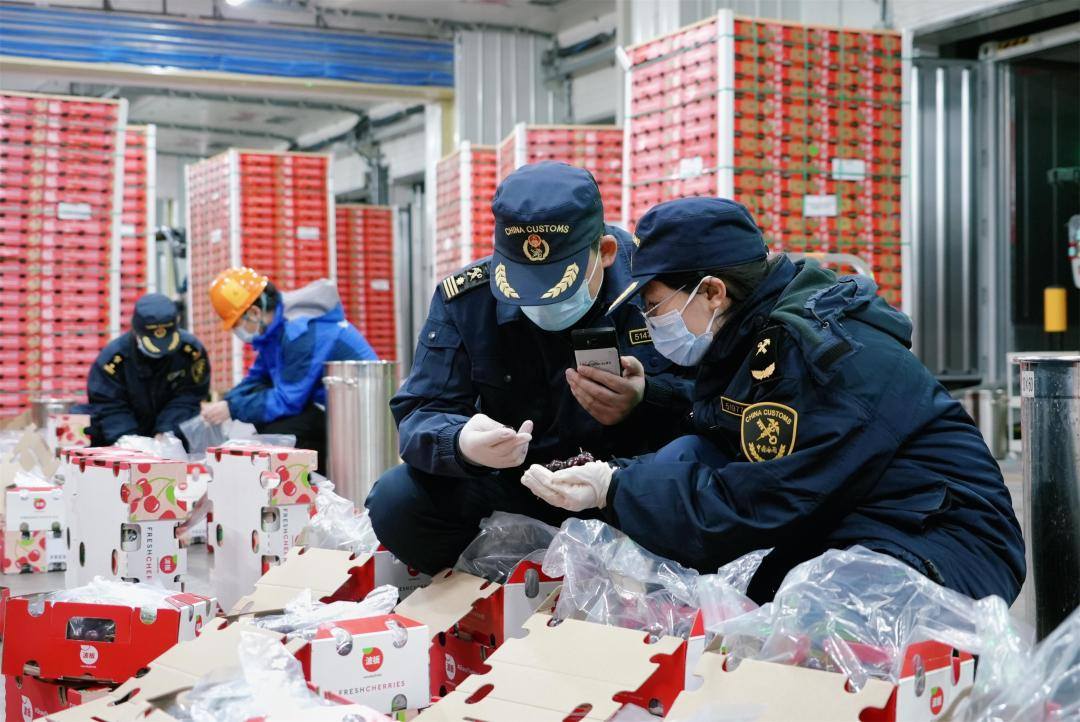 广州海关所属南沙海关关员在对进口智利车厘子进行监管。