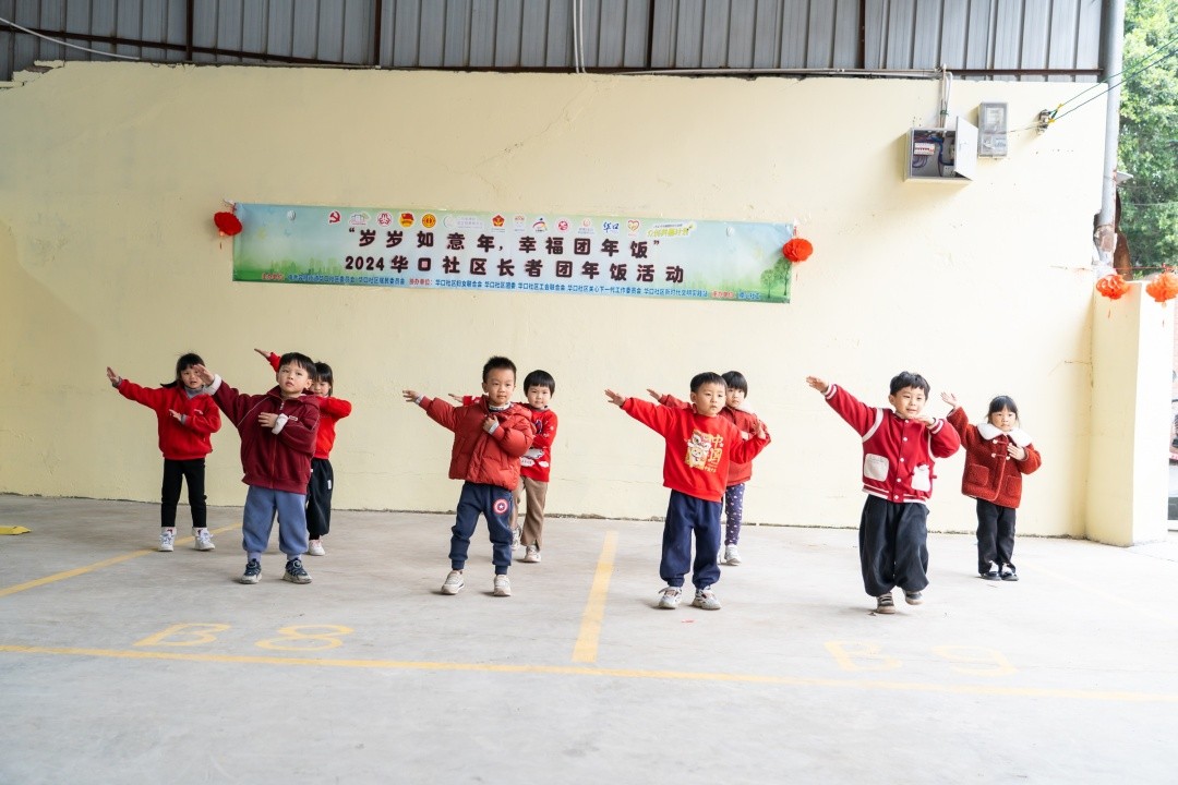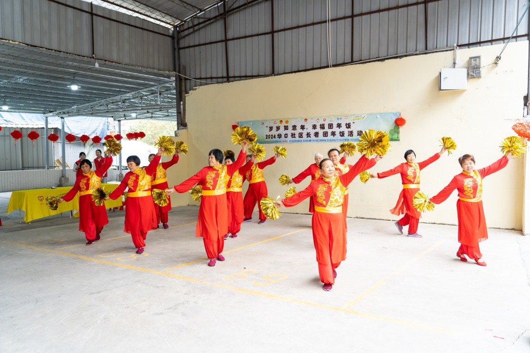 热闹的团年饭在一首《我们和祖国一起过年》舞蹈曲目中拉开序幕;众善乐融长者团队、华口太极队、华口曲艺社、华口幼儿园等纷纷登台献艺,欢快的舞蹈跳出了新年的喜悦,动听的歌曲唱出了对生活的热爱,活动现场载歌载舞,长者们看得津津有味,不时鼓掌叫好,热闹氛围氤氲。