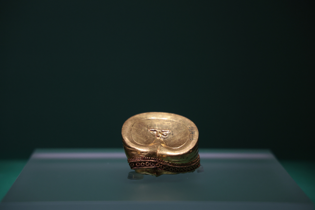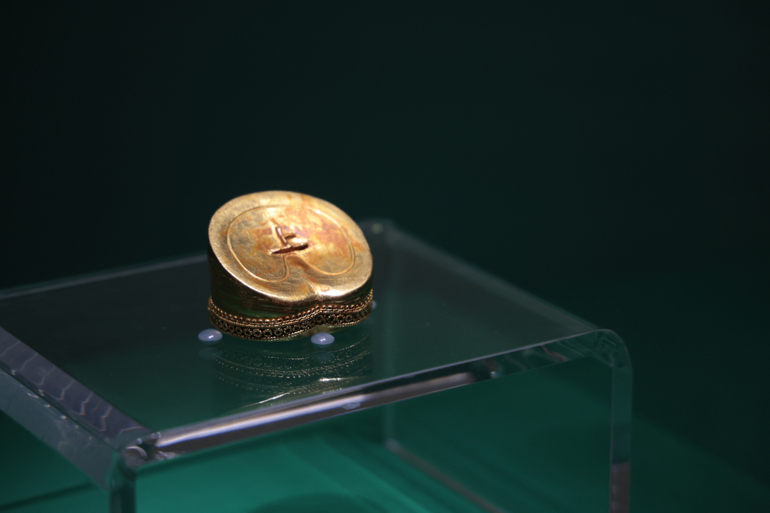 展览中还展出了同样炫目的麟趾金。刘贺墓出土麟趾金共25枚,含金量约为98.9%。麟趾金的顶部镶嵌琉璃或玉石,口沿外侧饰黄金掐丝纹带,底部铸有“上”“中”或“下”字。麟趾金始造于汉武帝太始二年(公元前95年),是汉武帝为神化“天马”“白麟”和“黄金”三件祥瑞事件而铸造的黄金纪念币,是对白麟趾瓣形状的模仿,用于对诸侯王的赏赐,目前仅见于刘贺墓、刘贺长子刘充国墓及河北定州八角廊40号汉墓(墓主可能为中山怀王刘修)。