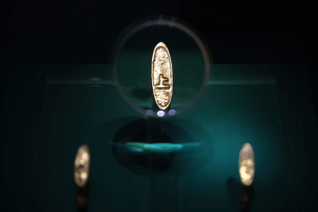 在当日开幕的“贺·岁——大汉海昏侯刘贺的人生岁月”中展出的这些惊人的黄金制品,是曾轰动一时的刘贺墓出土的数量庞大的黄金中的一部分。刘贺墓出土大号褭蹏金17枚,含金量约为99%,重量不一,多为240-250克;出土小号褭蹏金31枚,含金量约为98.6%,重量不一,多为28-38克。褭蹏金形似马蹄,为模仿天马足蹄形状,其中“褭”为汉代良马的专用名,“蹏”是“蹄”的异体字。大号褭蹏金顶部镶嵌琉璃或玉石,底部或铸有、或贴有“上”“中”或“下”字。因为“褭蹏”二字过于生僻,公众一般用“马蹄金”称呼它们。它们也是近年通过考古发掘最著名、最具“网红”特质的文物之一。