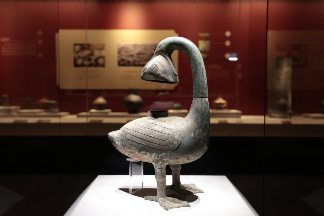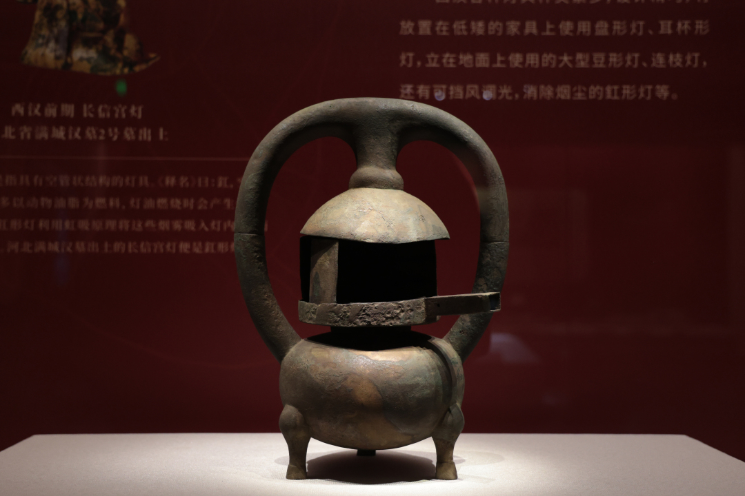 自2011年至今,西汉海昏侯墓及相关遗址的持续勘探、发掘、研究,让世人得以在文献之外,从考古的全新视角,重新审视刘贺其人其事和那段风云变幻的历史。海昏侯墓文物宝藏,一直为人津津乐道,赞叹不已。如展览中展出的雁鱼青铜釭(gāng)灯,灯的外形呈雁回首衔鱼伫立状,由雁衔鱼管、雁体、灯盘、灯罩组合而成。鱼身及雁颈、雁体中空相通。使用时灯火点燃,烟雾通过鱼和雁颈导入雁体内,被其中贮存的清水吸收溶解,达到环保无污染的效果。两片弧形灯罩可左右转动,既能挡风,又可调节灯光亮度。雁自古被视为“仁、义、礼、智、信”俱全的灵物,其嘴中鱼具有多子多福、夫妻恩爱、金玉满堂等吉祥寓意。此灯融科技、审美于一体,兼具实用和艺术双重功能。