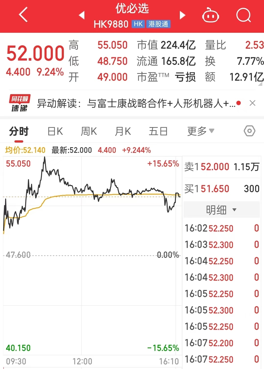 资本市场上,截至当日收盘,港股优必选股价上涨近10%,涨至52.00港元/股。