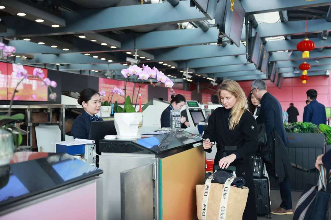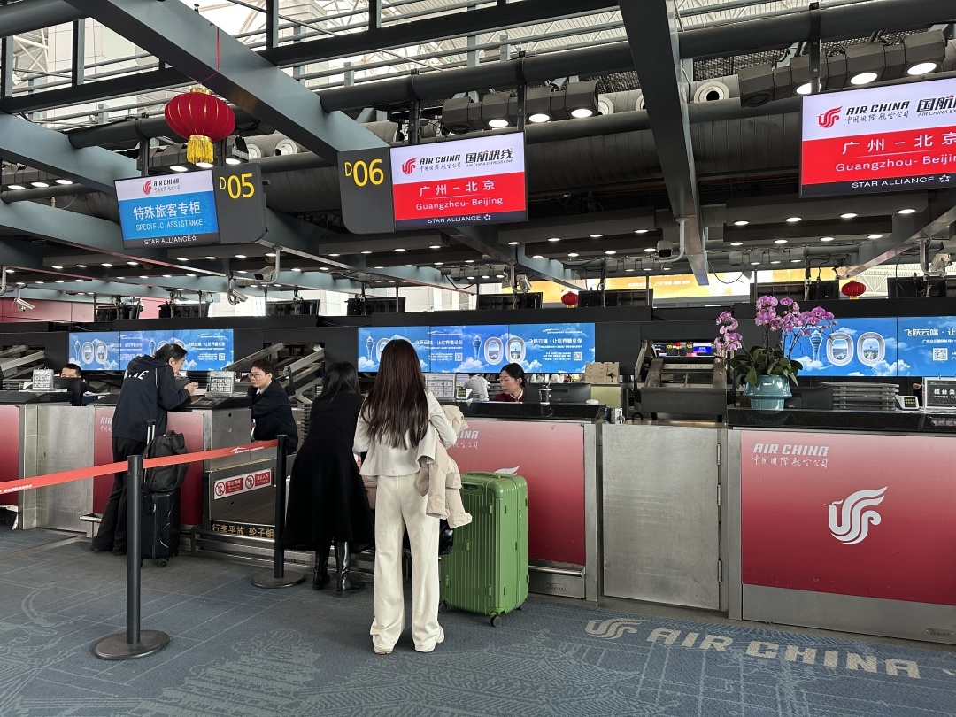 在一号航站楼国航值机柜台前,旅客钱女士为自己和爱宠图图办理了登机手续。钱女士来自重庆,在广州工作,准备提前返回家乡陪爸爸妈妈过年。