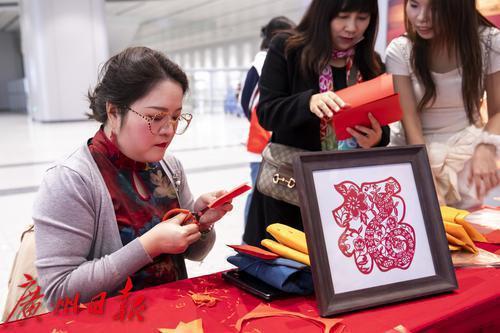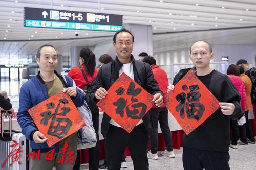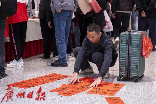 来自白云区书法家协会和广州铁路集团文联组织的多位书法名家为市民和旅客“挥春送福”。