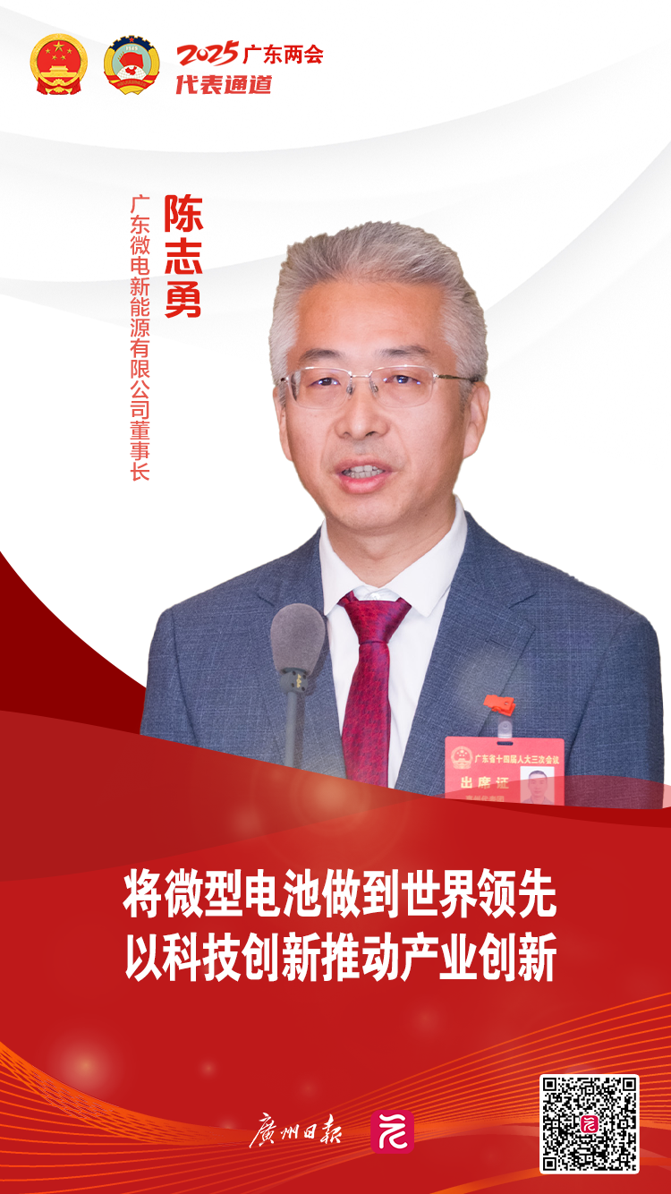 1月15日上午,广东省十四届人大三次会议举行首场“代表通道”集体采访,6位代表结合各自履职实际,回应热点关切,回答记者提问。省人大代表、广东微电新能源有限公司董事长陈志勇结合自身经历现场介绍了如何带领企业短期内把一颗纽扣般大小的电池做到世界领先。