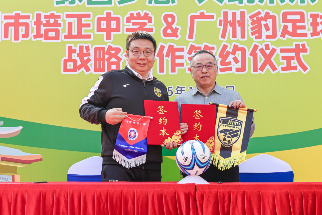 广州市培正中学校长杨先明和广州豹足球俱乐部总经理王朝阳代表各自单位在合作协议上签字。签约后,双方代表进行了队旗互换仪式。此后,广州市培正中学与广州豹足球俱乐部进行了一场精彩的足球对抗赛。