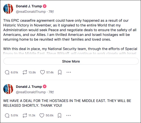 当天早些时候,美国候任总统特朗普在社交媒体上发文,将该协议的达成归功于自己在2024年美国总统选举中获胜,并强调其国家安全团队和中东问题特使的贡献。拜登则强调称,最终协议在很大程度上反映了他去年5月底提出的“确切轮廓”。