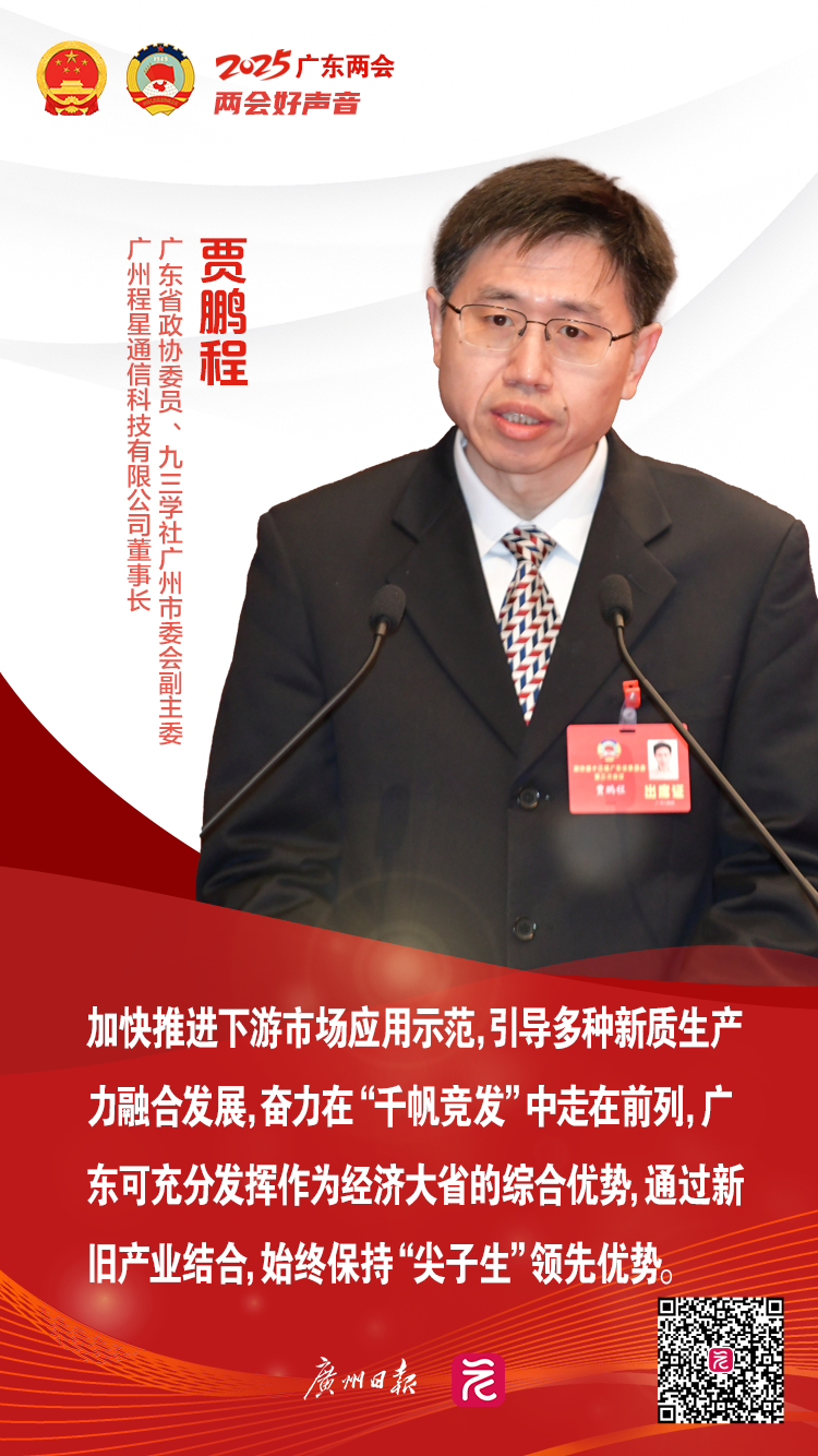 1月16日上午,广东省政协十三届三次会议举行大会发言,广东省政协委员、九三学社广州市委会副主委、广州程星通信科技有限公司董事长贾鹏程,以《聚焦卫星互联网应用产业建设 奋力在“千帆竞发”中走在前列》为题作大会发言。