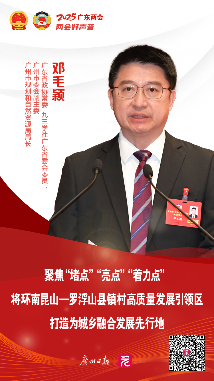 省政协常委、九三学社广东省委会委员、广州市委会副主委、广州市规划和自然资源局局长邓毛颖代表九三学社广东省委员会发言,题目为《推进环南昆山—罗浮山县镇村高质量发展引领区建设 打造城乡融合发展先行地》。