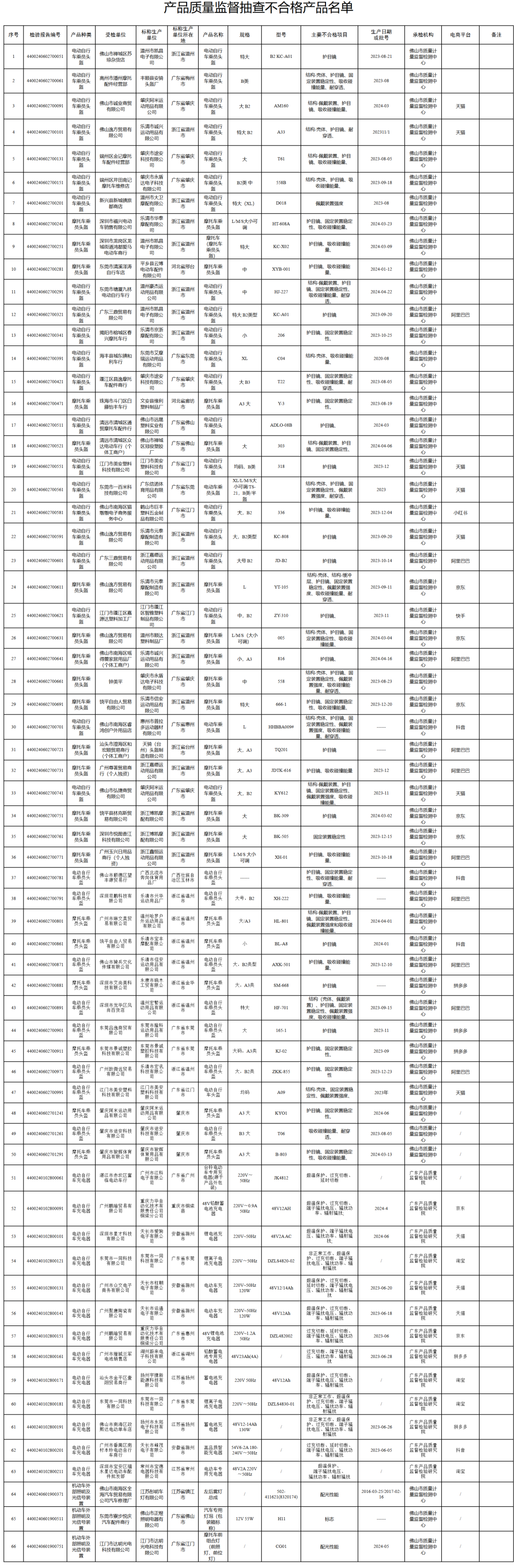 1月16日记者从广东省市场监管局获悉,该局去年开展了电动自行车乘员头盔、摩托车乘员头盔、电动自行车充电器、机动车外部照明及光信号装置等4种产品质量监督抽查,共发现不合格产品66款(线下抽查发现24款,线上抽查发现42款),其中涉及电动自行车乘员头盔29款。