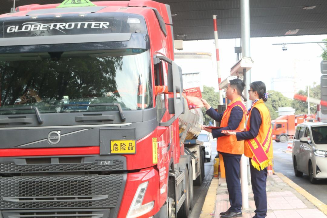 春运期间,广深高速萝岗中心收费站志愿者分队组织青年志愿者在出口收费广场为货车派发车道指引宣传单、超限超载安全宣传单,还开展现场答疑、咨询引路、送平安福袋等丰富多彩的便民服务,让安全驾驶的理念深入人心,助力畅顺春运、平安出行。