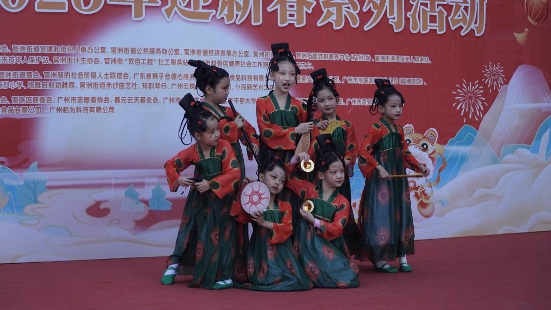 在一派喜庆祥和的气氛中,新春联欢会在官洲街道党工委副书记冯世杰的温情致辞下开幕。随后,海创幼儿园、赤沙舞蹈队、锦鲤艺术团、仑头小学、培雅启航幼稚园、赤沙曲艺社及知韵琴行等团体轮番上阵,社区居民们纷纷炫技献艺,欢声笑语交织,节日氛围浓厚。