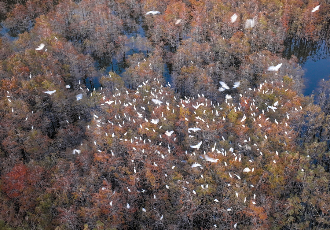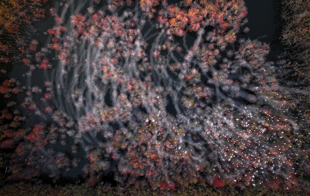这个冬日,顺德有两种颜色正在迅速走红。一种是落羽杉的红,另一种则是鹭鸟的白。在顺德水道沿线,落羽杉渐变的红色宛如“落霞”,伴随着千只白鹭盘桓其中,这宛若仙境的一幕,被来自广佛周边城市游客的无人机拍下,在网上火爆出圈。“落霞”与千鹭齐飞这一美景,正成为顺德除美食外,又一张吸引游客今年春节假期到顺德游玩的文旅新名片。