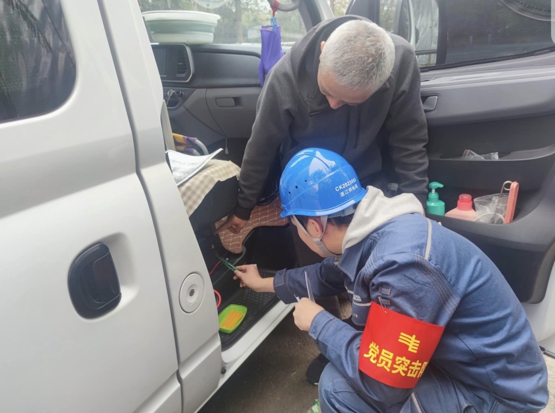 1月15日,雷州局党员突击队到处井村房车营地开展党员服务站活动,为远道而来的旅客提供便捷的用电服务。