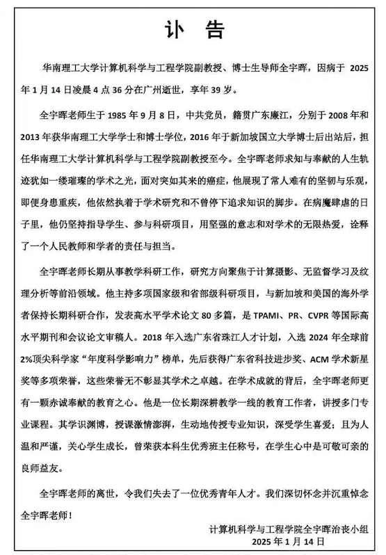 1月16日,记者从华南理工大学获悉,华南理工大学计算机科学与工程学院副教授、博士生导师全宇晖,因病于2025年1月14日凌晨4时36分在广州逝世,享年39岁。