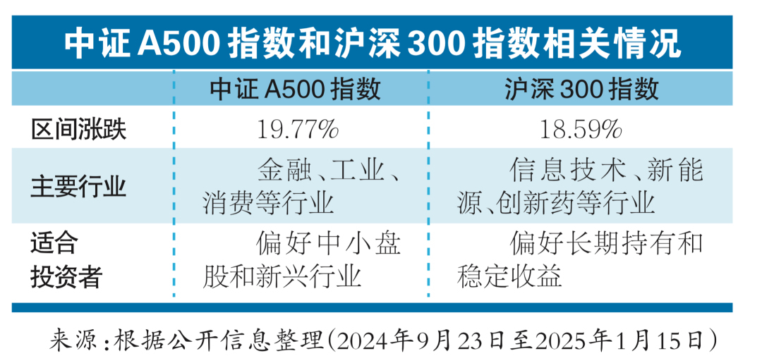 从投资者最关心的收益情况来看,由于中证A500发布于2024年9月23日,从2024年9月23日至2025年1月15日,中证A500和沪深300的区间涨幅分别为19.77%和18.59%。有金融业内人士指出,从历史数据来看,沪深300指数的波动性和回撤幅度相对较低,因此沪深300ETF适合偏好长期持有和稳定收益的投资者,尤其是那些偏好大盘蓝筹股的投资者;中证A500指数虽然包含的公司市值较小,但往往伴随着更高的成长潜力,因此中证A500ETF适合寻求高成长性和行业多样性的投资者,尤其是那些偏好中小盘股和新兴行业的投资者。