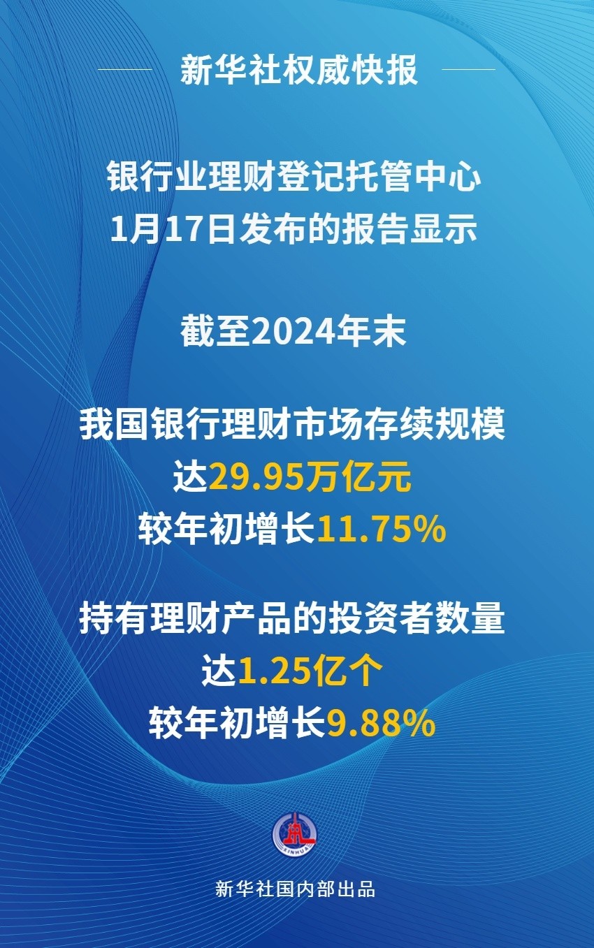 银行业理财登记托管中心1月17日发布的报告显示,截至2024年末,我国银行理财市场存续规模达29.95万亿元,较年初增长11.75%;持有理财产品的投资者数量达1.25亿个,较年初增长9.88%。