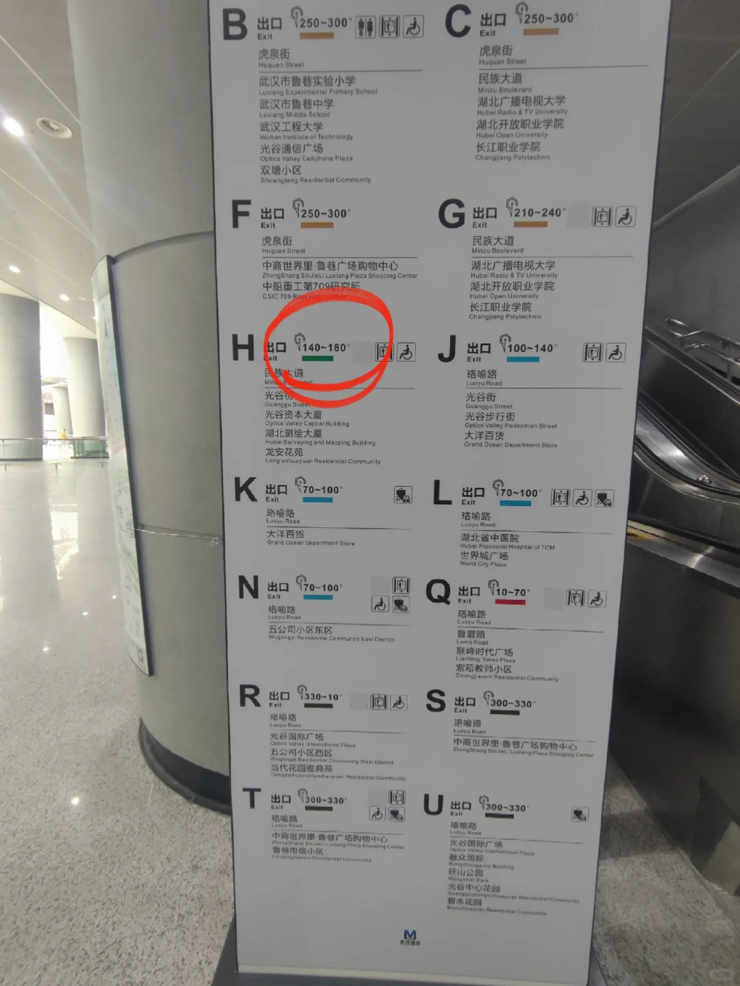 记者以乘客身份咨询,光谷广场站的一名工作人员解释道:“出口指引的标牌上标注了0°至359°的角度范围,乘客只需根据自己需要前往的方向,查找相应的度数范围即可找到出口。例如,如果乘客需要从L出口出站,他们只需找到标注为‘70°-100°’的区域,沿着地面上的指引线前行,便可顺利到达目标位置。”