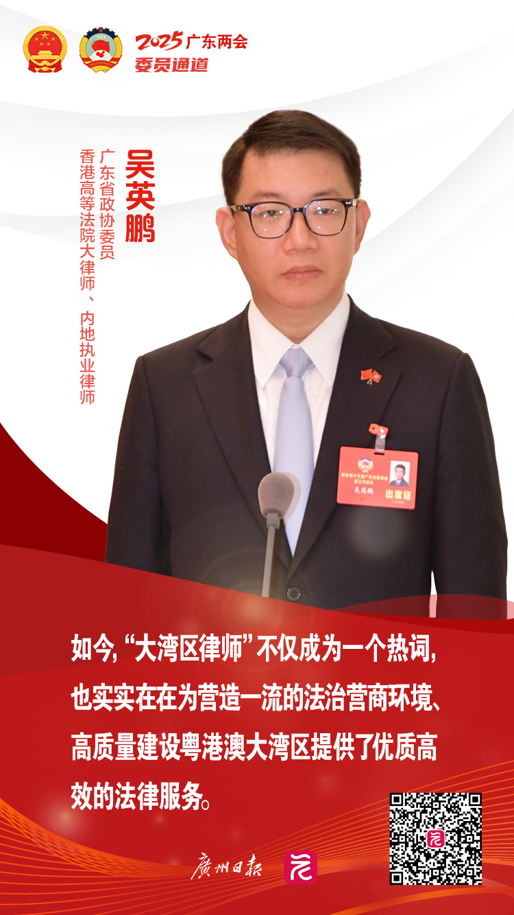 在吴英鹏看来,如今,“大湾区律师”不仅成为一个热词,也实实在在为营造一流的法治营商环境、高质量建设粤港澳大湾区提供了优质高效的法律服务。