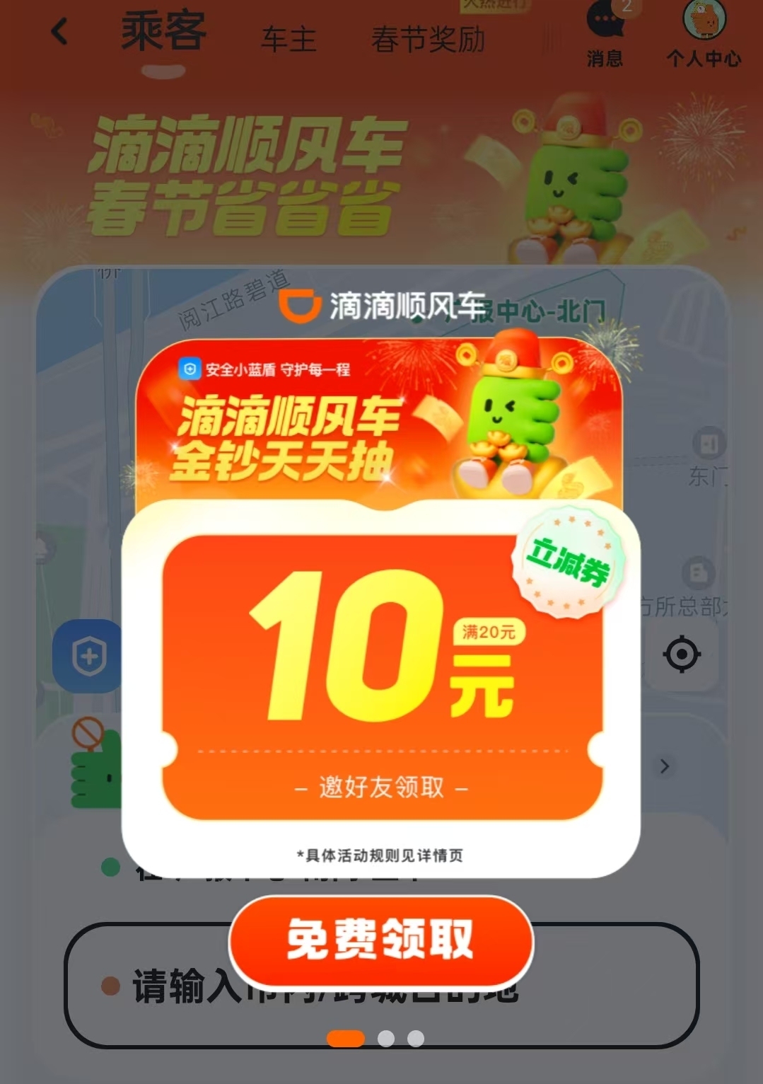 为进一步助力乘客和车主顺风出行,2025年1月18日至2025年2月12日期间,滴滴顺风车乘客用户可在滴滴出行App-顺风车主页或微信、支付宝滴滴顺风车小程序参与顺风车春节行程抽奖活动,每天有机会抽取蛇年定制金钞,除此之外,用户还可参与邀请好友参与“砍车费”等更多精彩活动。