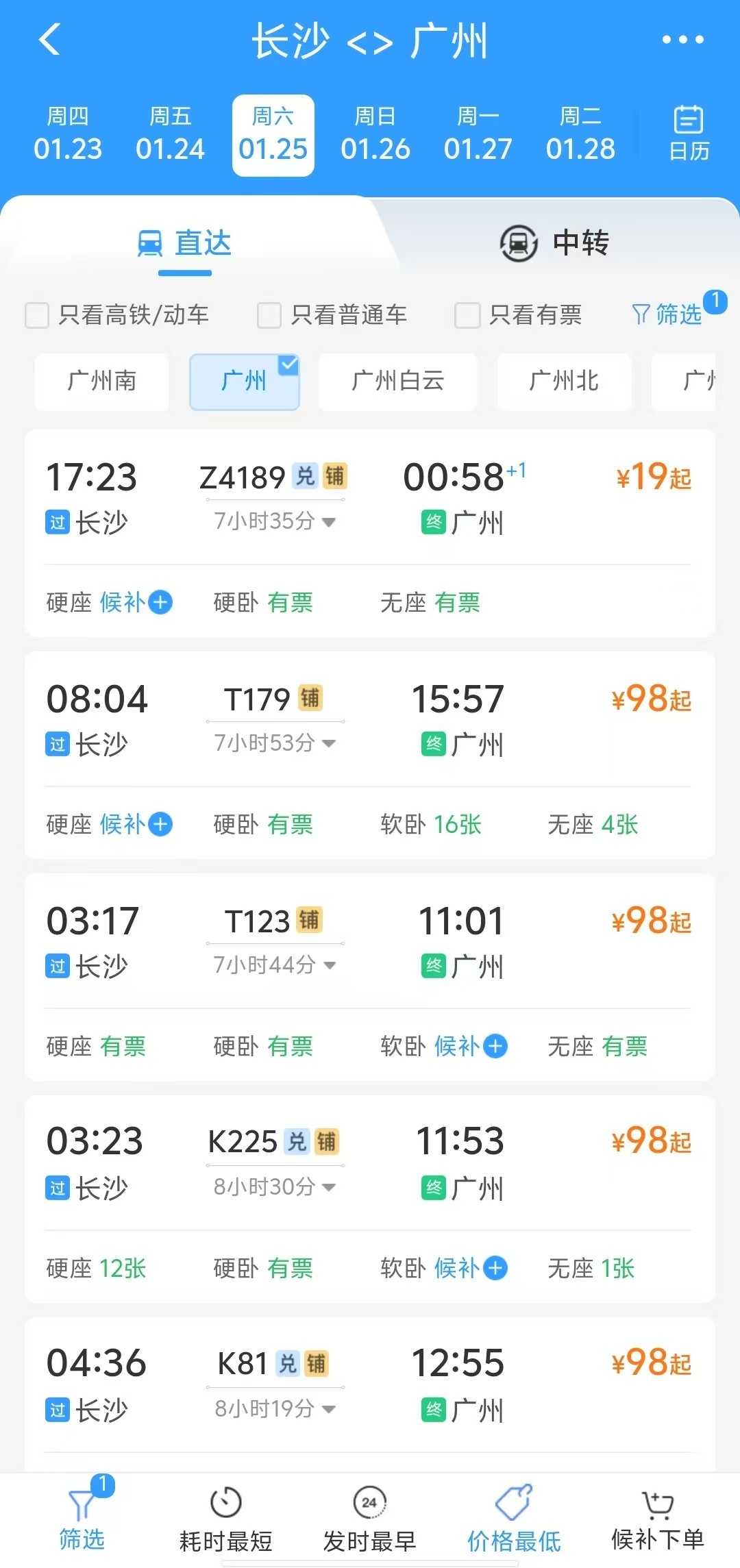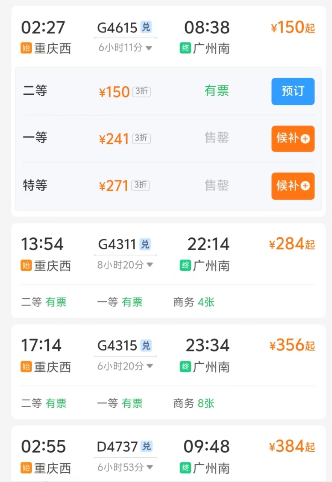记者从广铁集团获悉,为全力满足旅客多样化出行需求,铁路部门在加大运力投入的同时,针对部分车次加大票价优惠力度,让旅客出行更实惠。广铁集团客运部高级工程师黄瑜楚介绍,春运期间,铁路客流呈现明显的单向特征,反向客流相比之下大大减少。为此,铁路部门对部分非紧张时段、方向的旅客列车实行优惠票价。普速车最大优惠低至2折,比如1月25日长沙至广州的Z4189次列车,打完2折后硬座票价仅需19元;动车组最大优惠低至3折,比如重庆西至广州南的G4615次列车,打完3折后二等座票价仅需150元,成都东至广州南的G4775次商务座仅需650元、二等座仅需198元。通过灵活折扣、有升有降的市场化票价机制,不仅让旅客拥有更多出行选择和实惠,还能合理调节客流峰谷,充分用好铁路运力资源。