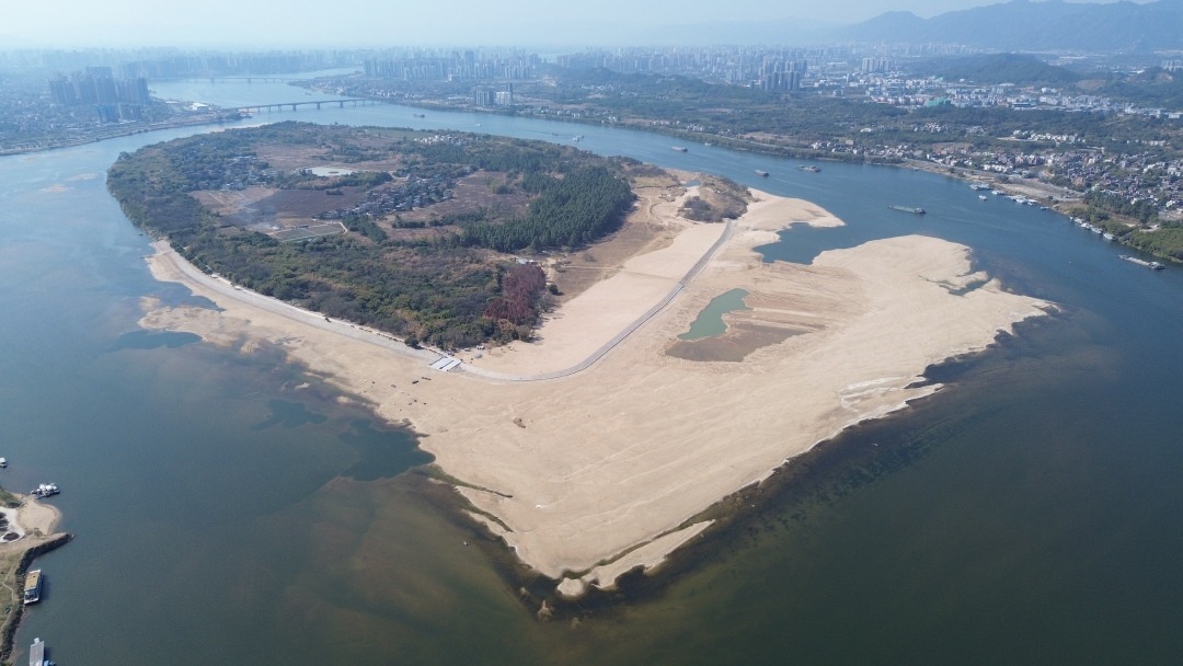 空中俯瞰伦洲岛,首先映入眼帘的便是那片广阔无垠的沙滩。在冬日暖阳的照耀下,沙滩像是被洒上了一层金粉,散发出迷人的金色光芒,与澄澈的蓝天、碧绿的北江水相互映衬,构成了一幅如诗如画的美景。