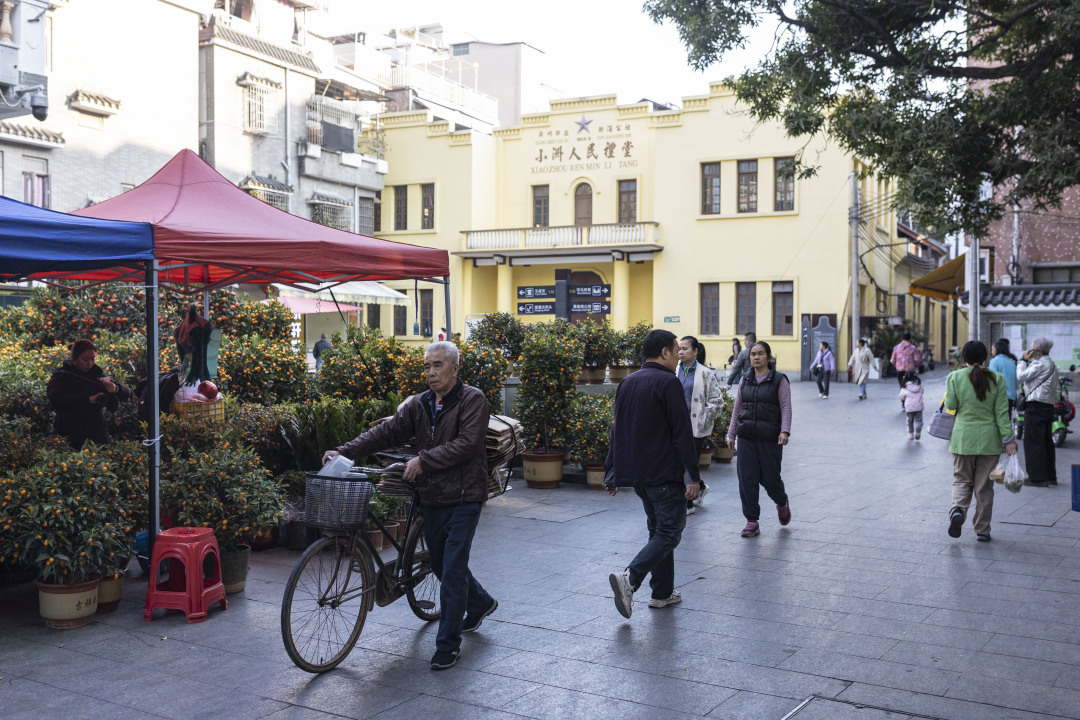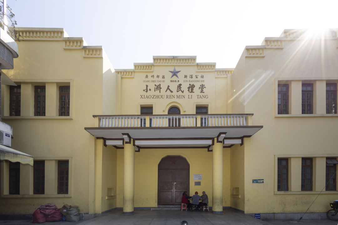 小洲人民礼堂位于小洲村拱北大街20号,建于1959年,是全村男女老少总动员,一砖一瓦把礼堂建设起来,是海珠区为数不多的苏式礼堂,见证小洲村工业发展历史。2011年10月,被公布为海珠区登记保护文物单位。