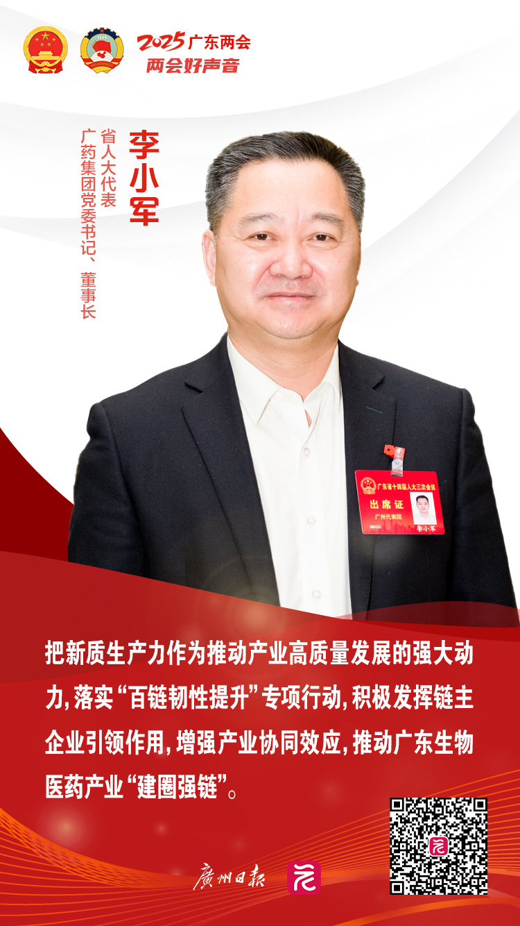 “省政府工作报告中提到,‘巩固提升制造业当家优势、建设现代化产业体系,因地制宜发展新质生产’,特别提到要大力发展生物医药等新兴产业,培育生物制造等未来产业,这让我倍添信心,也深感责任重大。”省人大代表、广药集团党委书记、董事长李小军表示,作为广东省生物医药产业链主企业,广药集团将坚决落实广东省有关工作部署,坚持制造业当家,全面推进高水平科技自立自强,把新质生产力作为推动产业高质量发展的强大动力,落实“百链韧性提升”专项行动,积极发挥链主企业引领作用,增强产业协同效应,推动广东生物医药产业“建圈强链”。