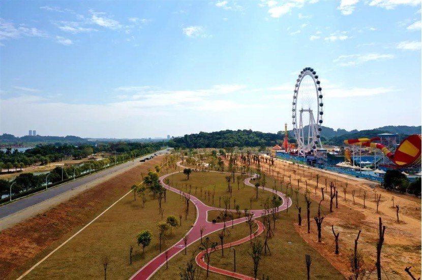 江湾公园是荔湖街“百千万工程”重点项目之一,其地理位置优越,西邻荔湖欢乐湾文旅项目,东面与增江画廊湿地公园一路之隔,北靠荔湖大道,南邻连江路。公园面积约40亩,整体呈长方形,布局与东侧增江画廊相互呼应:以中心位置的阳光草坪和漫步游径为核心,以乡土树种和茶花、紫荆、紫薇等多种主题花林景观为骨架,通过蜿蜒曲折的穿林步道贯穿南北、联动东西,打造“鸟语花香、树影婆娑、清风徐来”的都市绿洲。