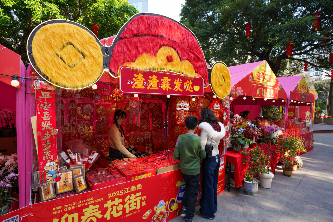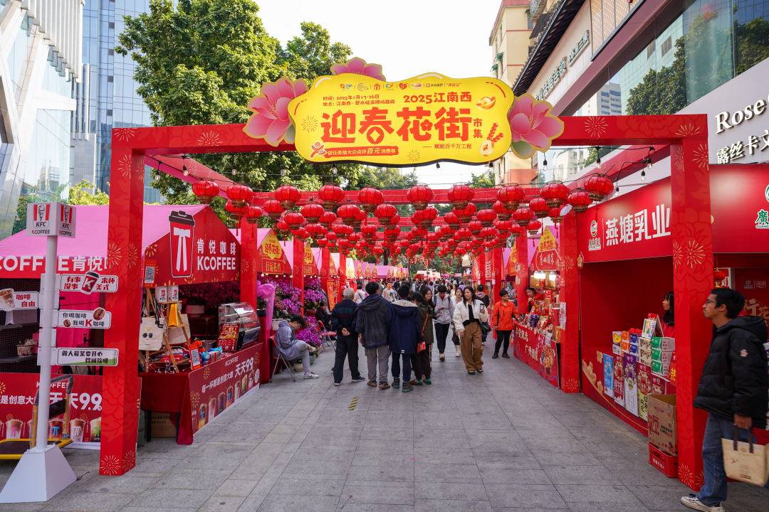 江南西迎春花街市集自1月17日至26日在瑶溪牌坊至十香园路段举行。17日傍晚,记者现场看到,市集上汇聚各式各样的精品年花、迎春年货、非遗手作以及美食小吃等琳琅满目的商品。