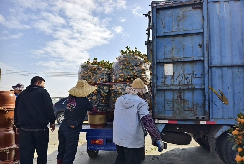 1月15日上午,记者到都那村年桔种植基地采访,只见装运年桔的车辆来来往往,桔农们忙着搬货。桔农们欣喜地表示,年桔已销售超五成,再过几天就能全部清场。