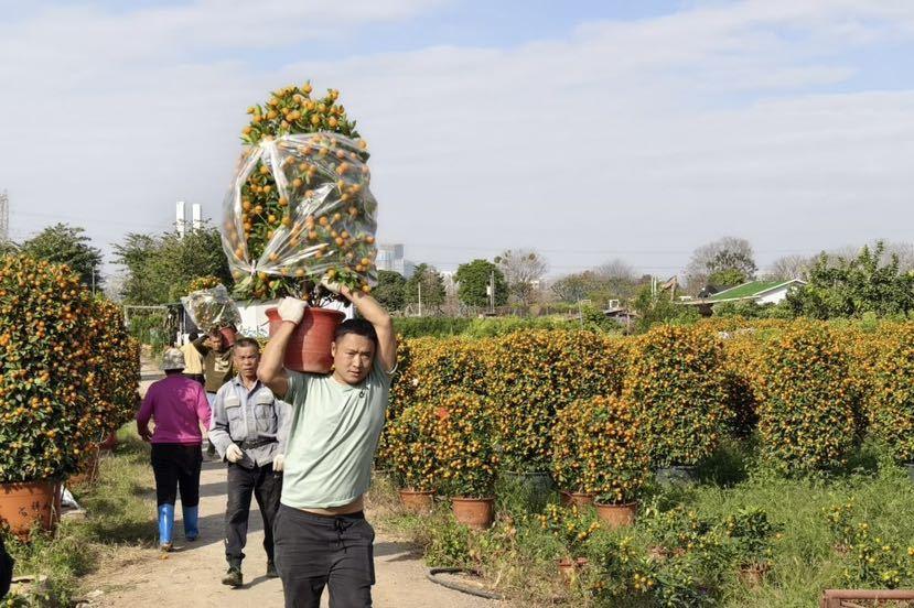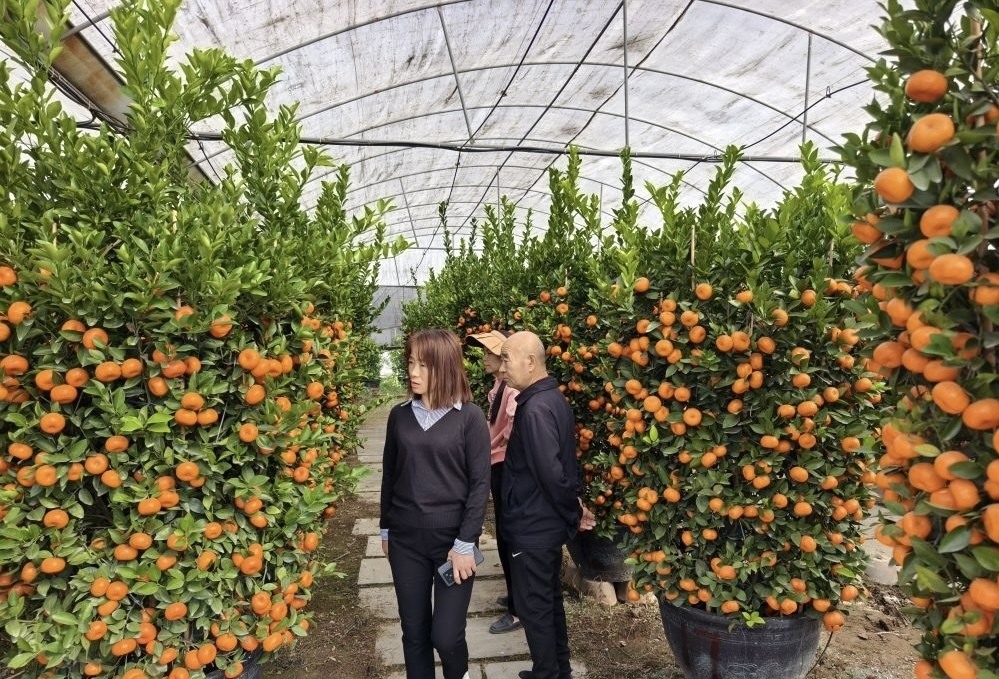 虾公桔场也是一片繁忙景象,有的客户穿梭在桔树当中看货,有的客户则在忙着提货。该桔场以种植朱砂桔为主,大棚内摆放着数百株盆栽的朱砂桔,一盆有3米多高,批发价2000多元。种植户黄女士开心地说,桔场有朱砂桔500多盆,九成以上被预订,现已经出货一半多,很快就卖完了。