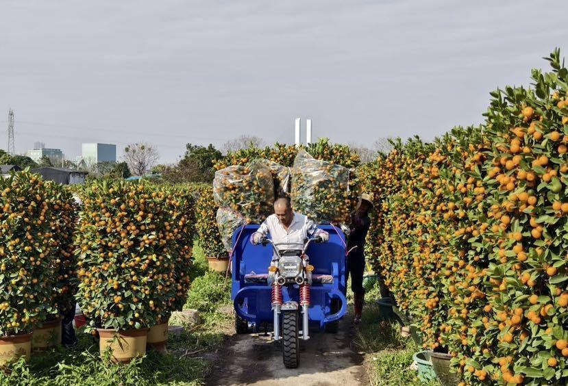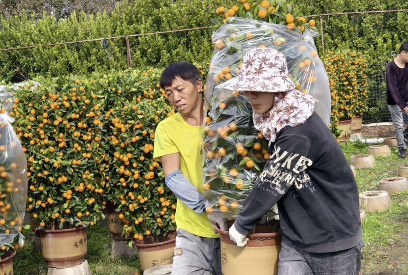 在靠近锦彪桔场的路边,停着一辆大货车,车上满满当当装着大盆小盆的年桔。装货的师傅兴奋地说:“大大小小的年桔能装200多盆,是送往海南的。”种植户何女士满脸笑容地告诉记者,今年桔场有五六千盆年桔上市,95%以上在两个月前就被预订了,现在已经出货一半,再过几天就可以清空。