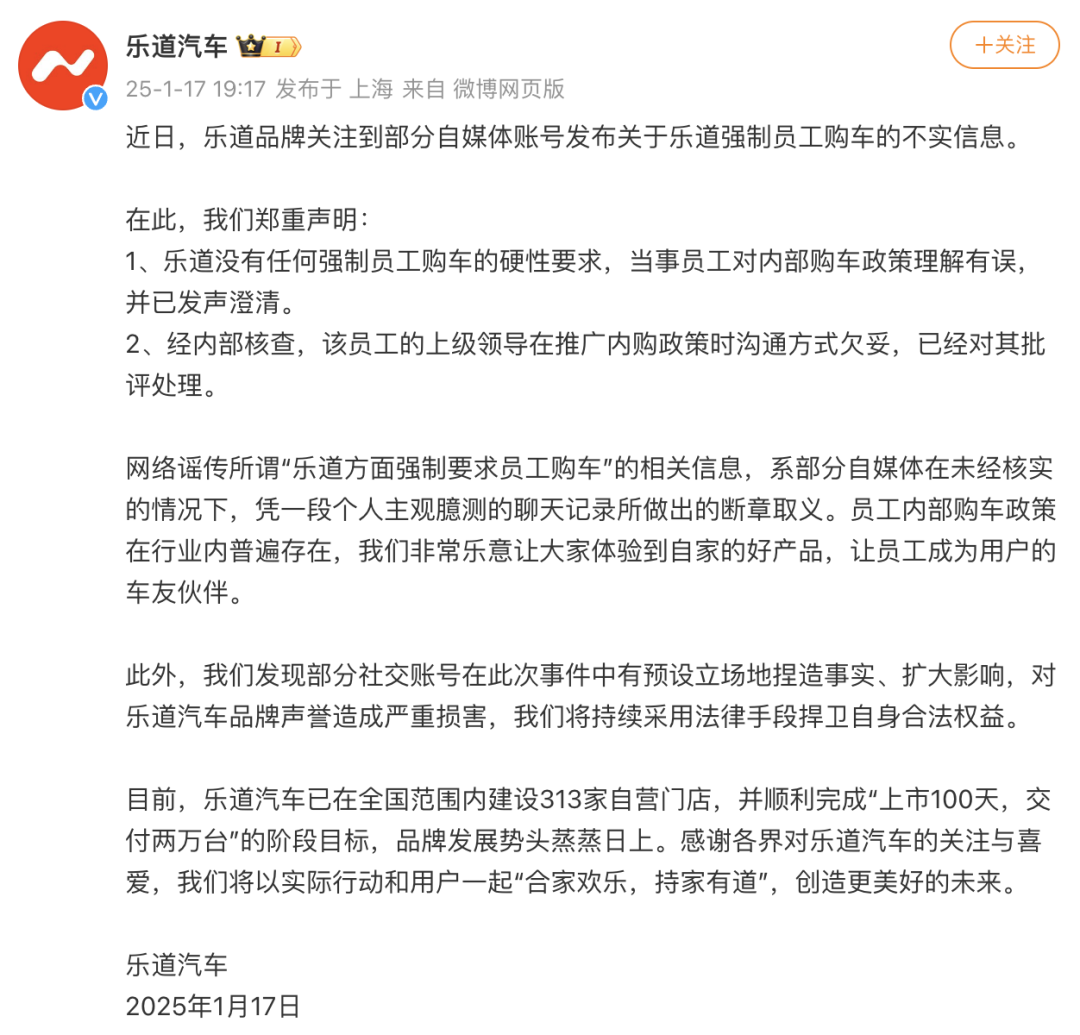 近日,蔚来汽车旗下的乐道品牌被推上舆论的风口浪尖,社交平台关于“乐道强制员工购车”的消息被广泛传播。1月17日,“乐道品牌”微博官方账号发布声明称:不实信息,“乐道没有任何强制员工购车的硬性要求,当事员工对内部购车政策理解有误,并已发声澄清。”