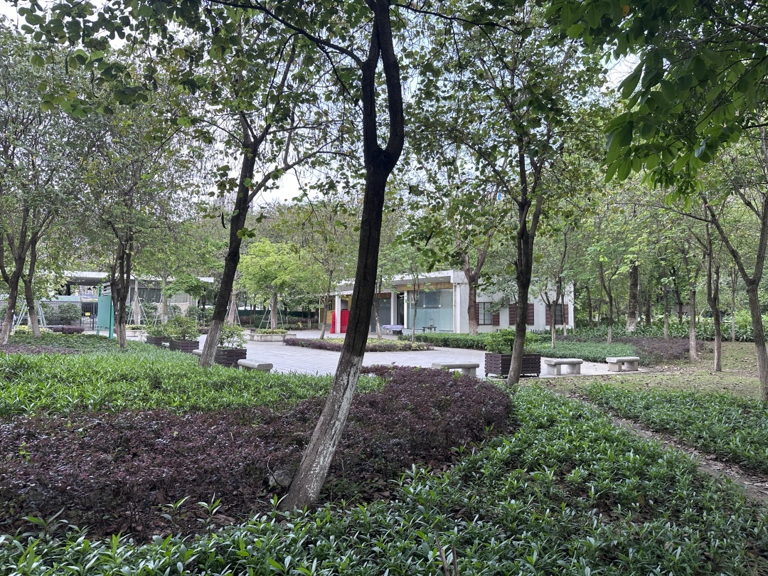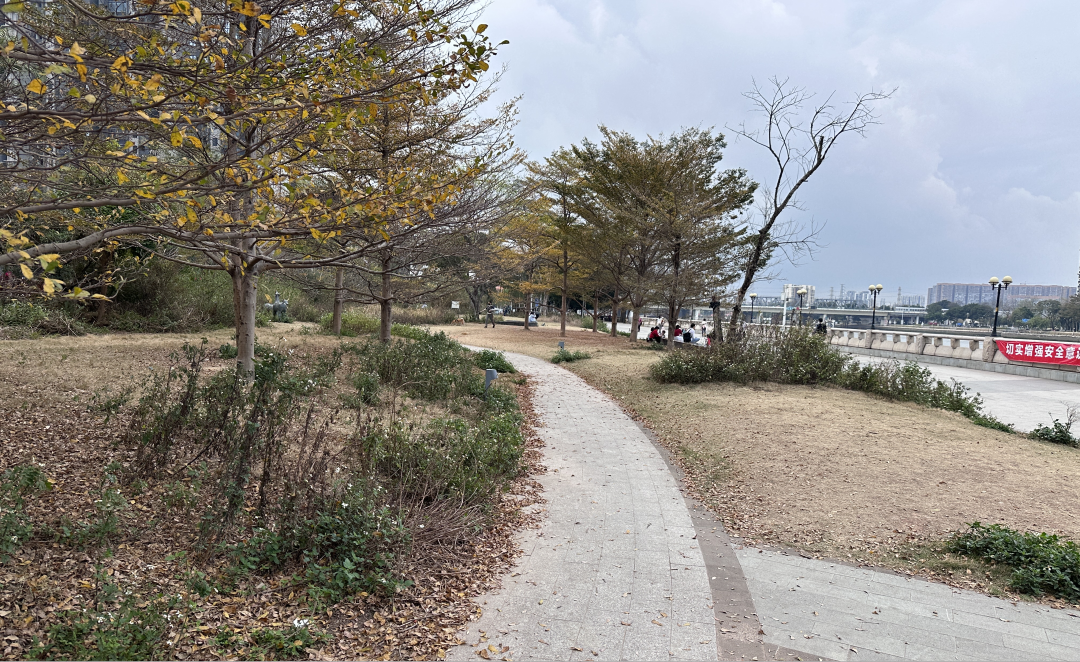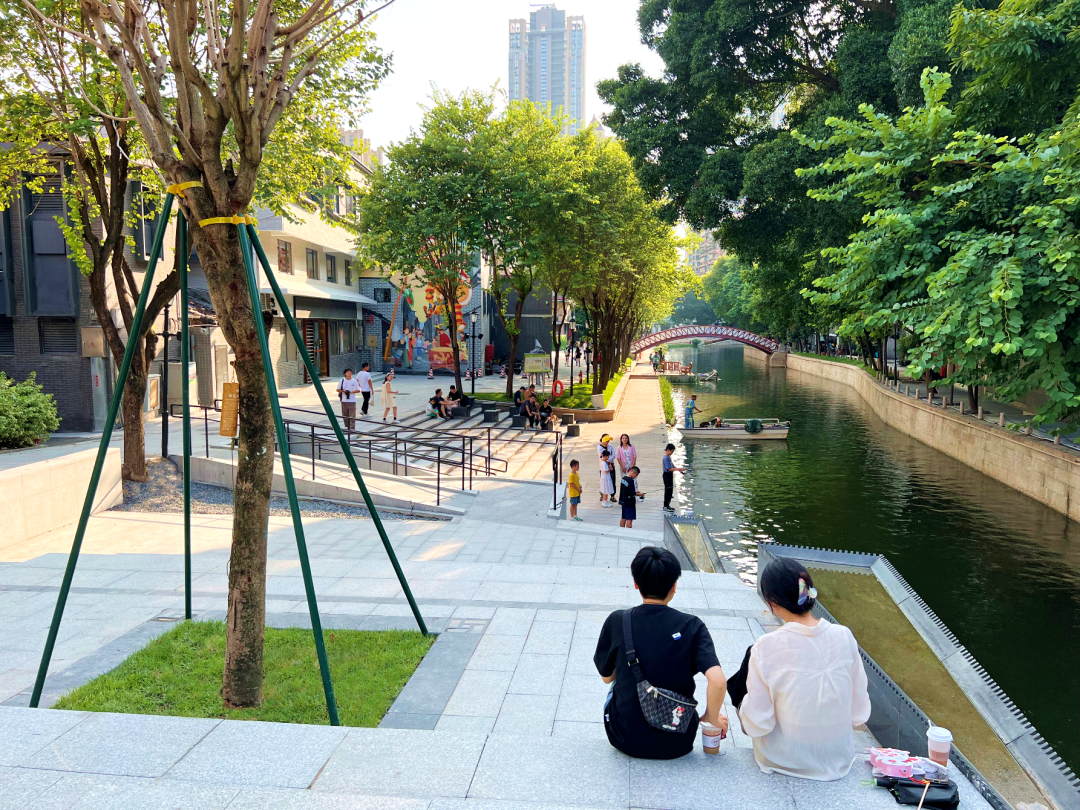 花地河碧道示范段为浣花西路-茶滘涌段,周边新小区众多。原先,沿线是一片缺乏人气的闲置绿地,林木茂密但仅有一条狭窄步道通行,整体存在望江视线不通、活动功能不足、慢行系统缺失、功能配套不完善等问题。满足人的需求,是花地河示范段滨水环境整治工程的出发点和落脚点。