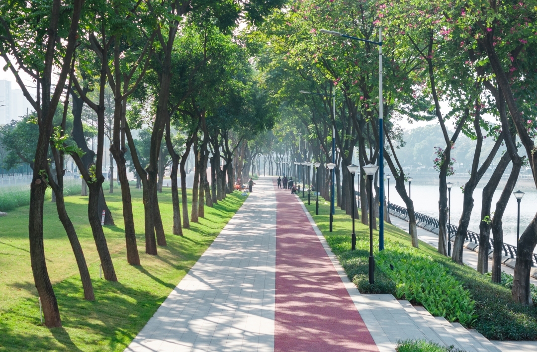 项目设计方、广州市城市规划勘测设计研究院人居环境景观院高级工程师沈子茜介绍,花地河东侧道路(浣花西路-茶滘涌)是新近完工的市政道路,在该道路未建成时,河边绿地一部分被占作车道。如今,随着市政道路的落地、花地河示范段的完工,部分被占的空间被还作慢行空间,林荫之下,漫步道、骑行道、慢跑道宽敞、平顺,以阶梯隔离、绿化隔离等方式实现互不干扰,并通过护栏隔离实现人车分流;二级堤之间增加了无障碍通道,广钢铁路专用线花地河大桥过街设施也被优化,下桥后不会直冲机动车道,出行的安全感、舒适感大大提升。项目还重点完善配套设施,补充休息停留区,提供全龄段、全天候户外活动空间,在绿化景观上,体现千年花乡底蕴、花卉主题元素以及生态海绵设计。