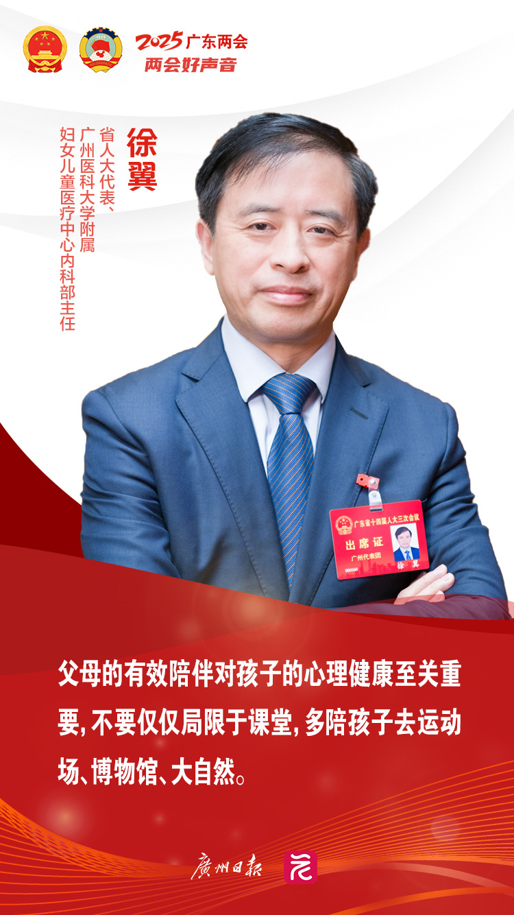 2025年广东省十件民生中,第十项是“为青少年提供更加普惠专业的心理健康服务”,提到将升级建设青少年心理健康公益服务体系,维护青少年心理健康,强化家校社协同育人,提高学生家长心理健康教育素养等。作为一名儿科医生,省人大代表、广州医科大学附属妇女儿童医疗中心内科部主任徐翼的建议关注同样的话题。