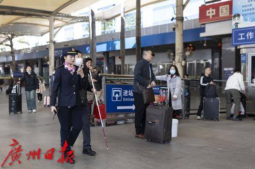 图为地铁工作人员将一位视障乘客带往广州火车站进站口。