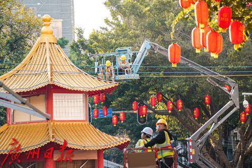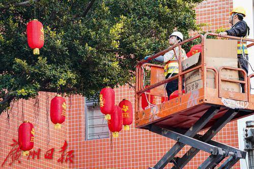 工人为花市两侧树木挂上灯笼。