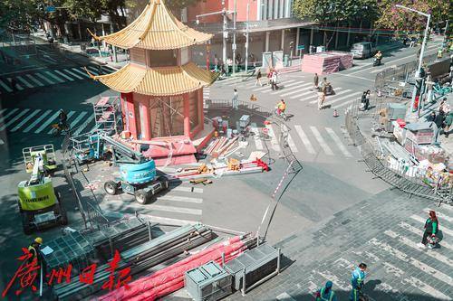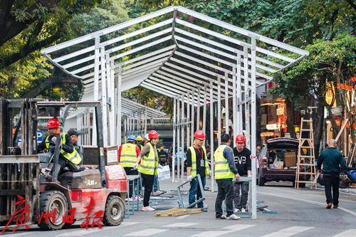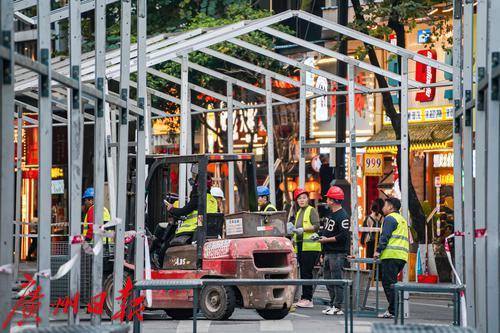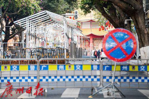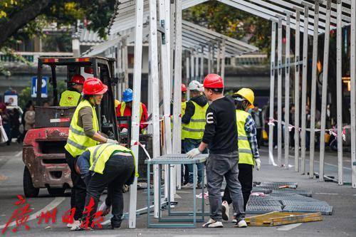 春节越来越近,花市是广州过年的“重头戏”,越秀区的西湖路花市更是万众瞩目的焦点,1月25日是开锣日。1月17日,记者来到西湖路现场,只见这里一片繁忙的施工景象,交警已将机动车道路封闭,工人们也正紧锣密鼓地为花市的到来做着搭建准备。