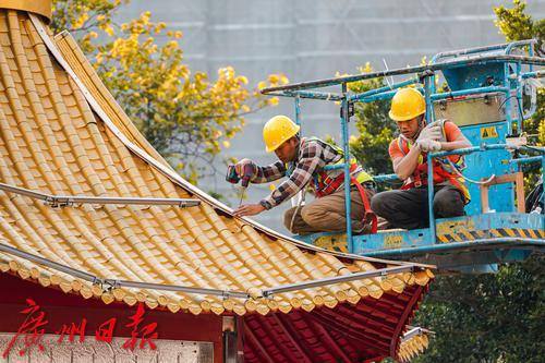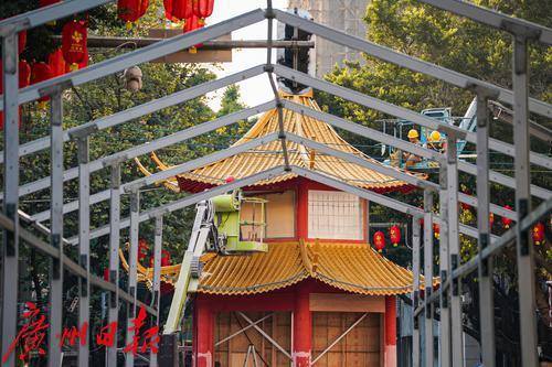 主牌楼的搭建工作正有条不紊地进行着,工人们将一块块装饰部件逐步安装到位,一座宏伟壮观、充满节日气息的牌楼已初现雏形。附近,摊位棚架也在同步搭建,整齐排列的棚架,为后续商户们的入驻做好准备。拉电线的工人在棚架和路旁穿梭,电力的供应为花市的灯光夜景提供保障,夜晚灯光亮起的花市将更有氛围。
