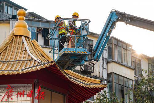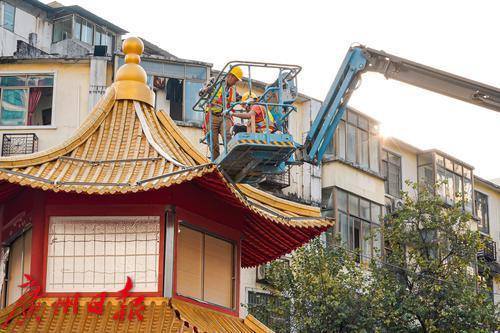 西湖路和教育路路口,工人为灯塔做装饰工作。