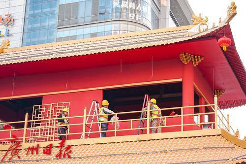 工人们装饰花市主牌楼。