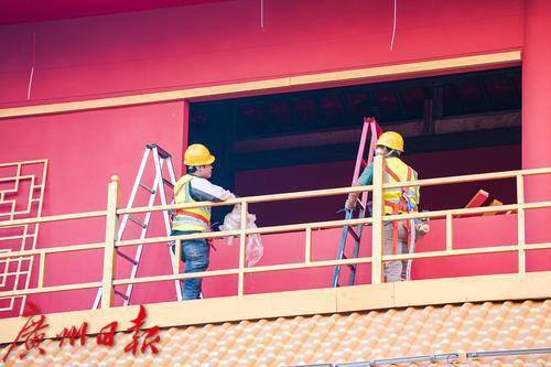 阳光下,工人搭建、装饰灯塔。